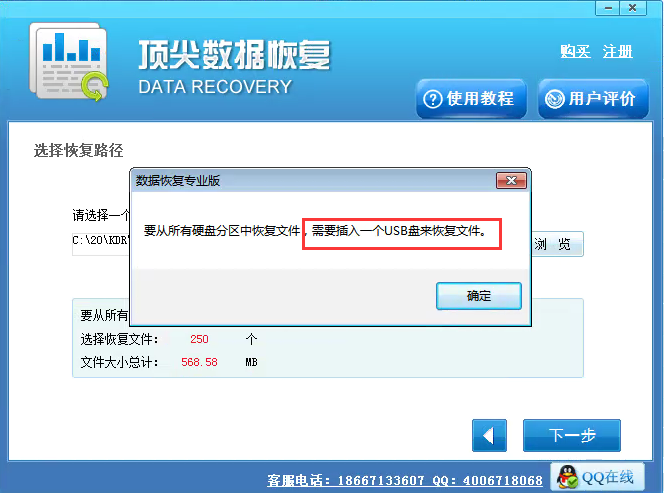 要从所有硬盘分区中恢复文件,需要插入一个USB盘来恢复文件
