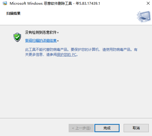 经过了几分钟的时间,扫描已结束,没有检测 到恶意软件。