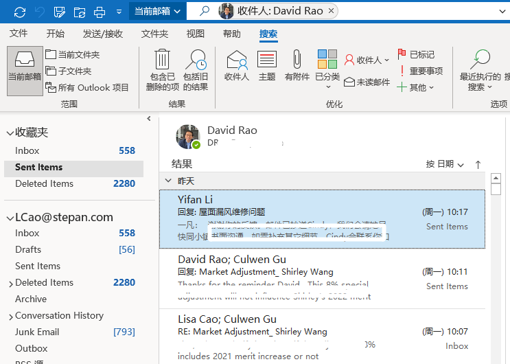 outlook 2016的搜索框中去搜索当前发件箱人员名称时,出现6件人,而且搜索出来的邮件内容也不正确。