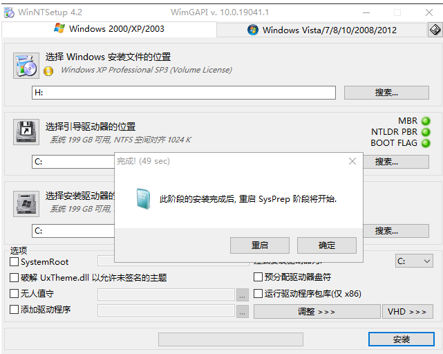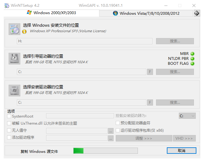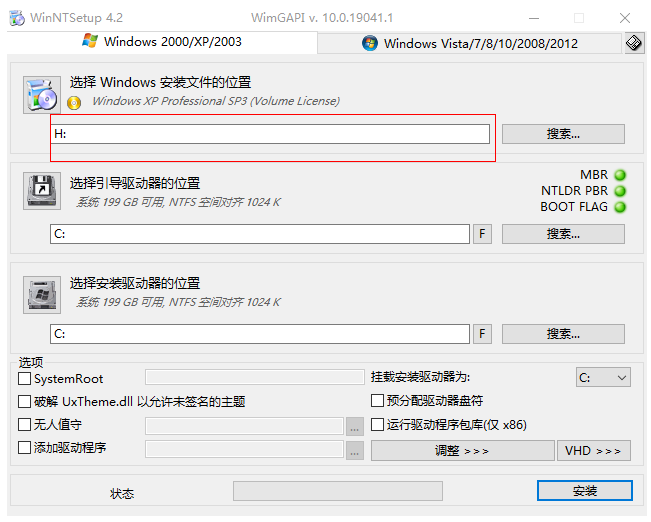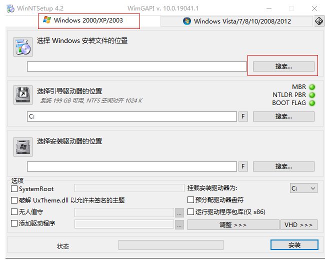 再次打开WinNTSetup,选择Windows 2000/xp/2003,点击搜索。