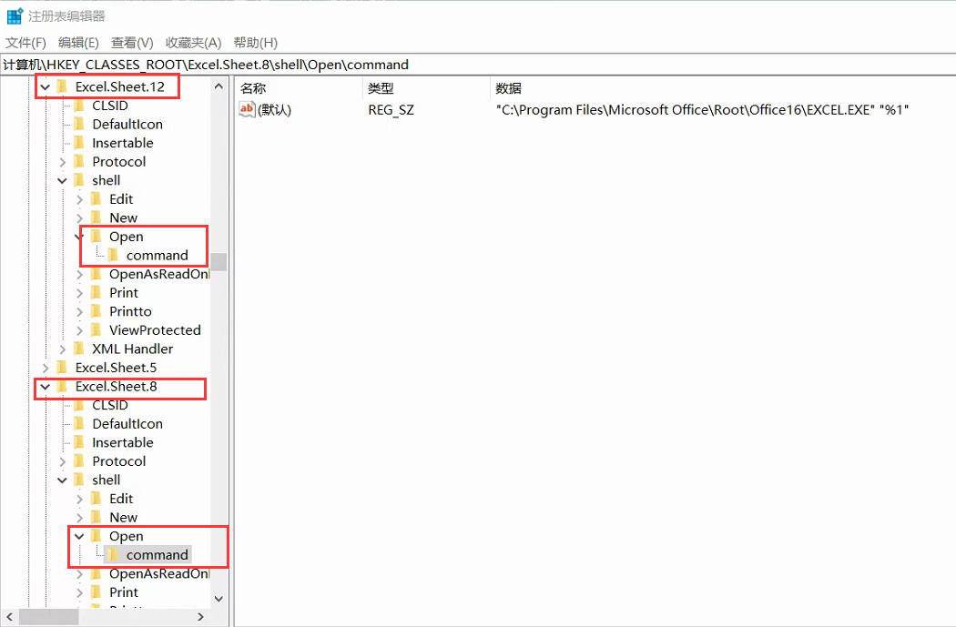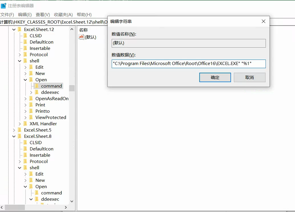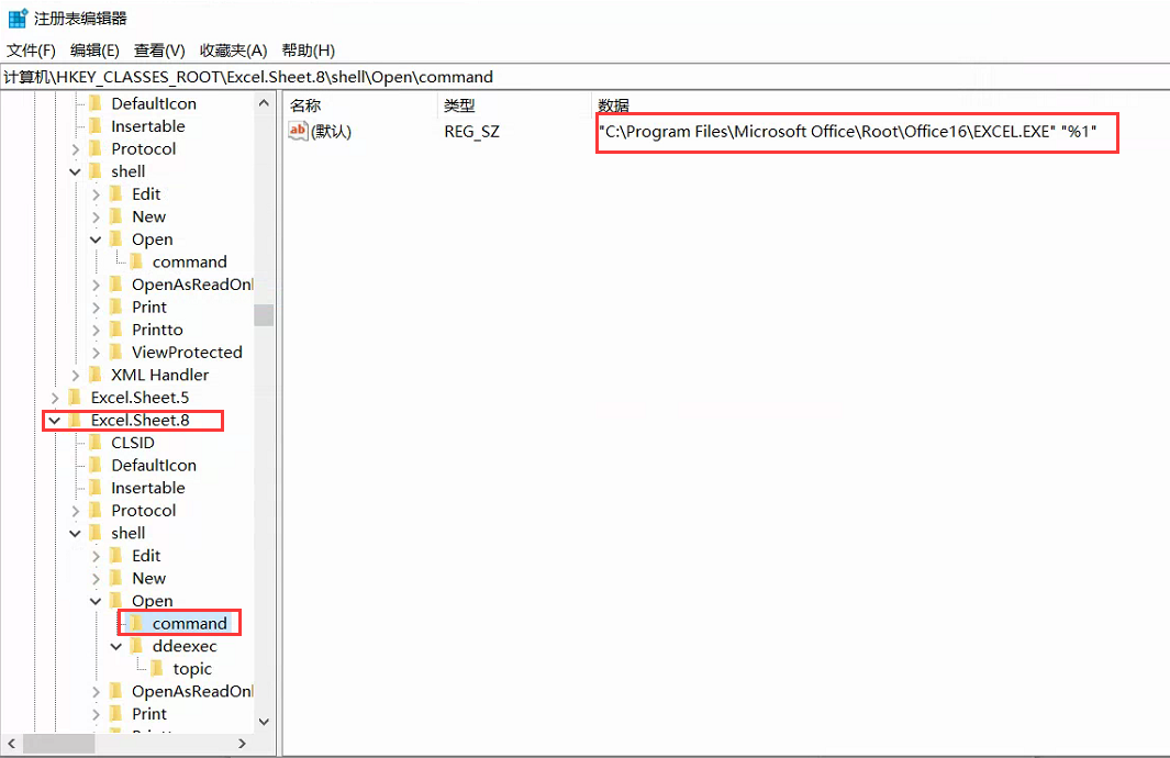 3.跟第2步同样的操作,只不过这次是找到【HKEY_CLASSES_ROOT\Excel.Sheet.8\shell\Open\command】,然后将其值修改为类似这样【"C:\Program Files\Microsoft Office\Root\Office16\EXCEL.EXE" "%1"】,注意【"%1"】前面有个空格,也就是把原来【EXCEL.EXE】后面所有的内容替换成【 "%1"】