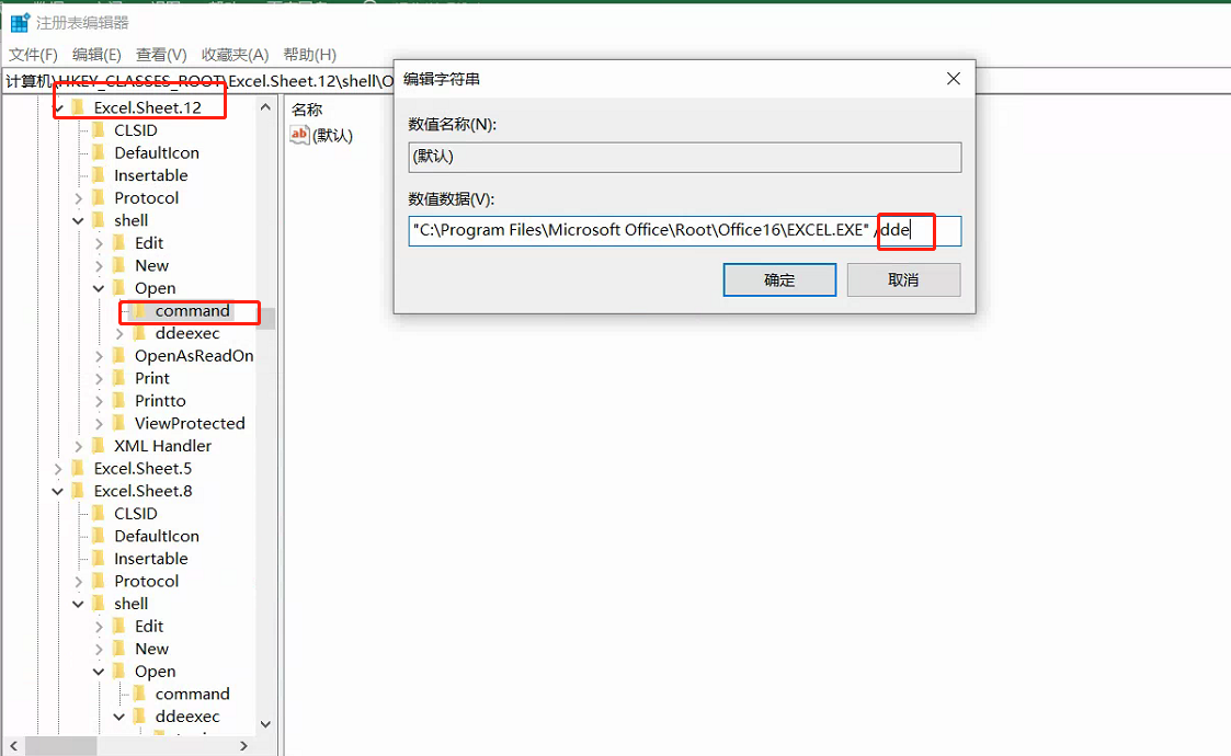 Excel文档要打开两次才正常的原因不同于Word,主要是一个叫DDE 1.Win+R,打开运行,输入regedit,打开注册表。 2.找到【HKEY_CLASSES_ROOT\Excel.Sheet.12\shell\Open\command】,将它下面的(默认)的值改成类似这样【"C:\Program Files\Microsoft Office\Root\Office16\EXCEL.EXE" "%1"】,注意【"%1"】前面有个空格,也就是把原来【EXCEL.EXE】后面所有的内容替换成【 "%1"】